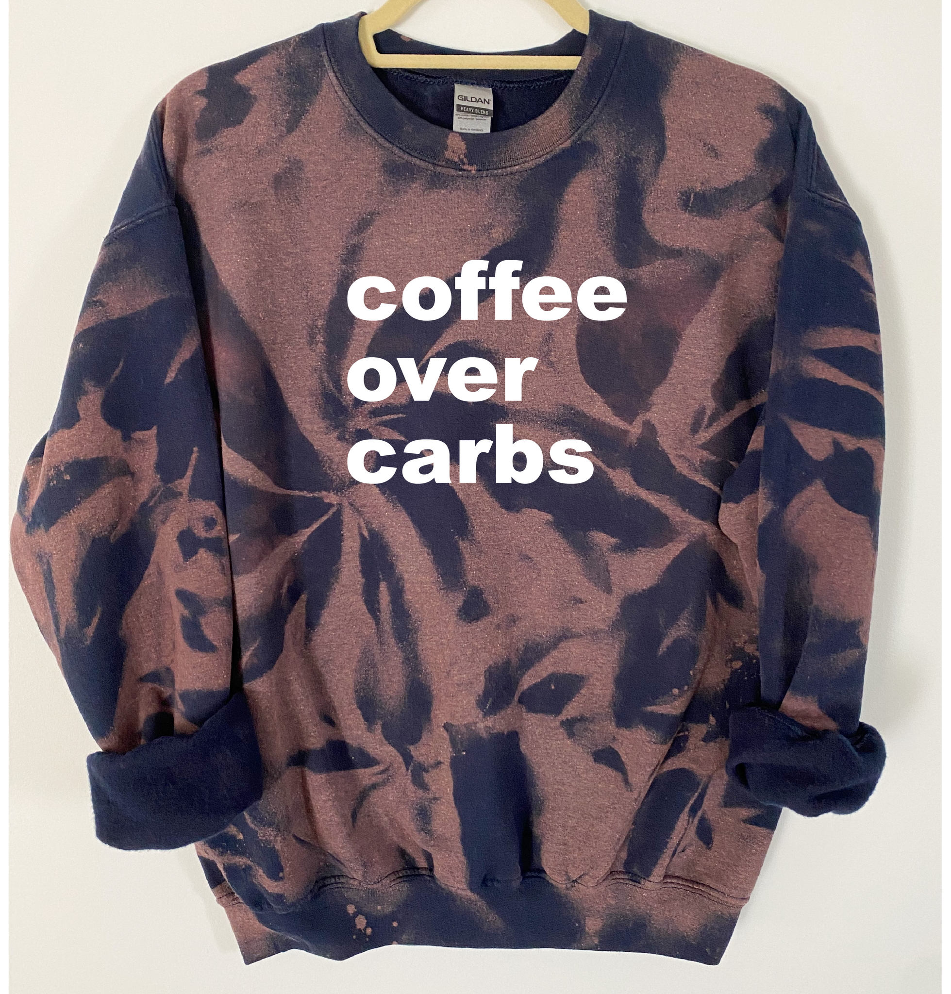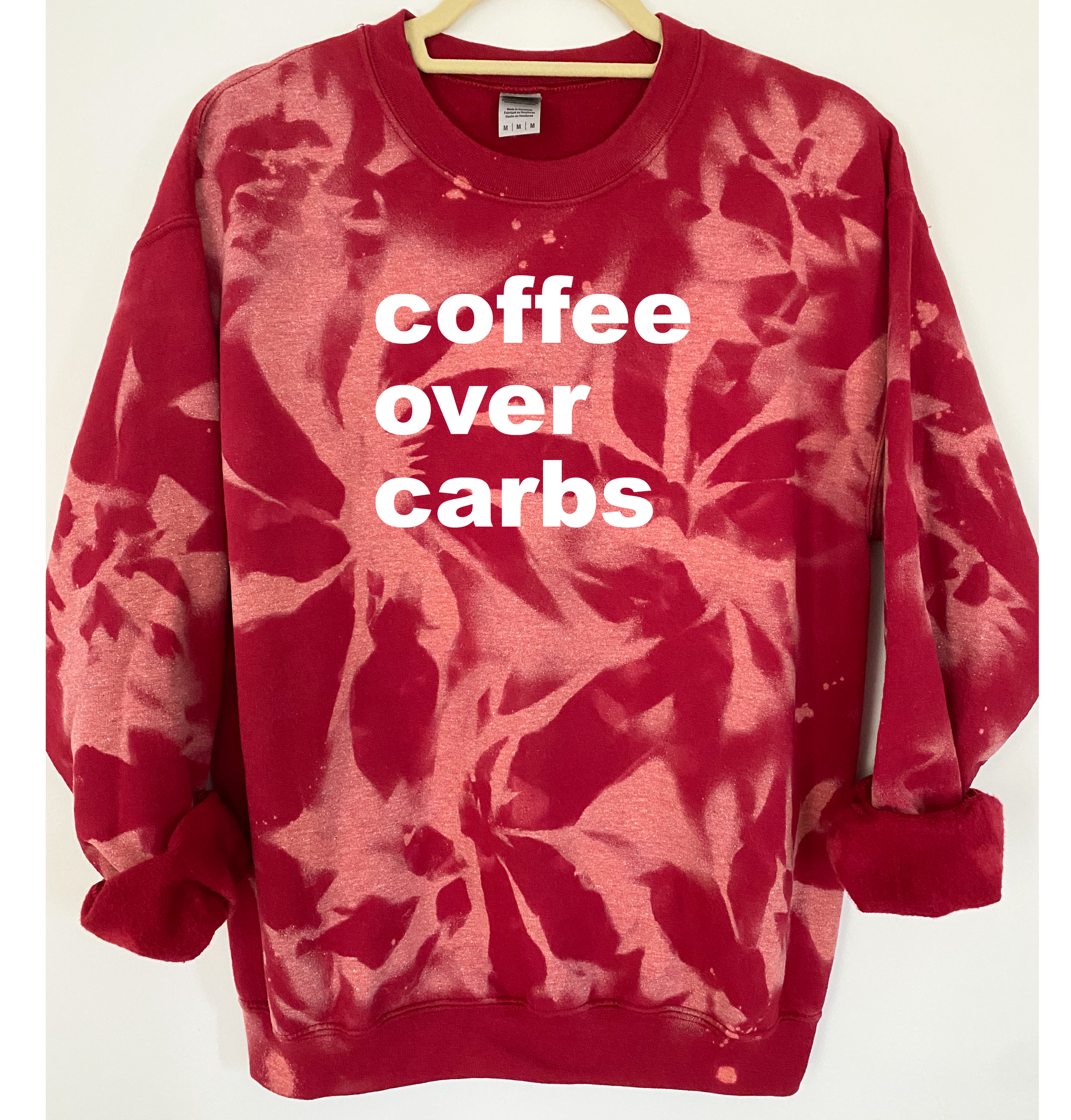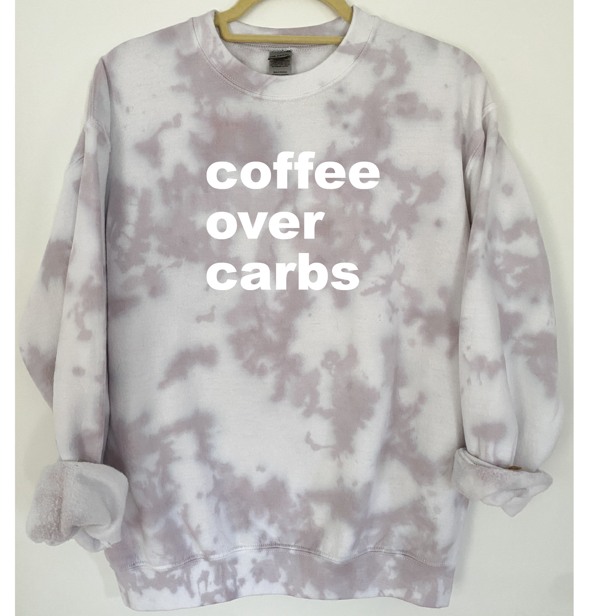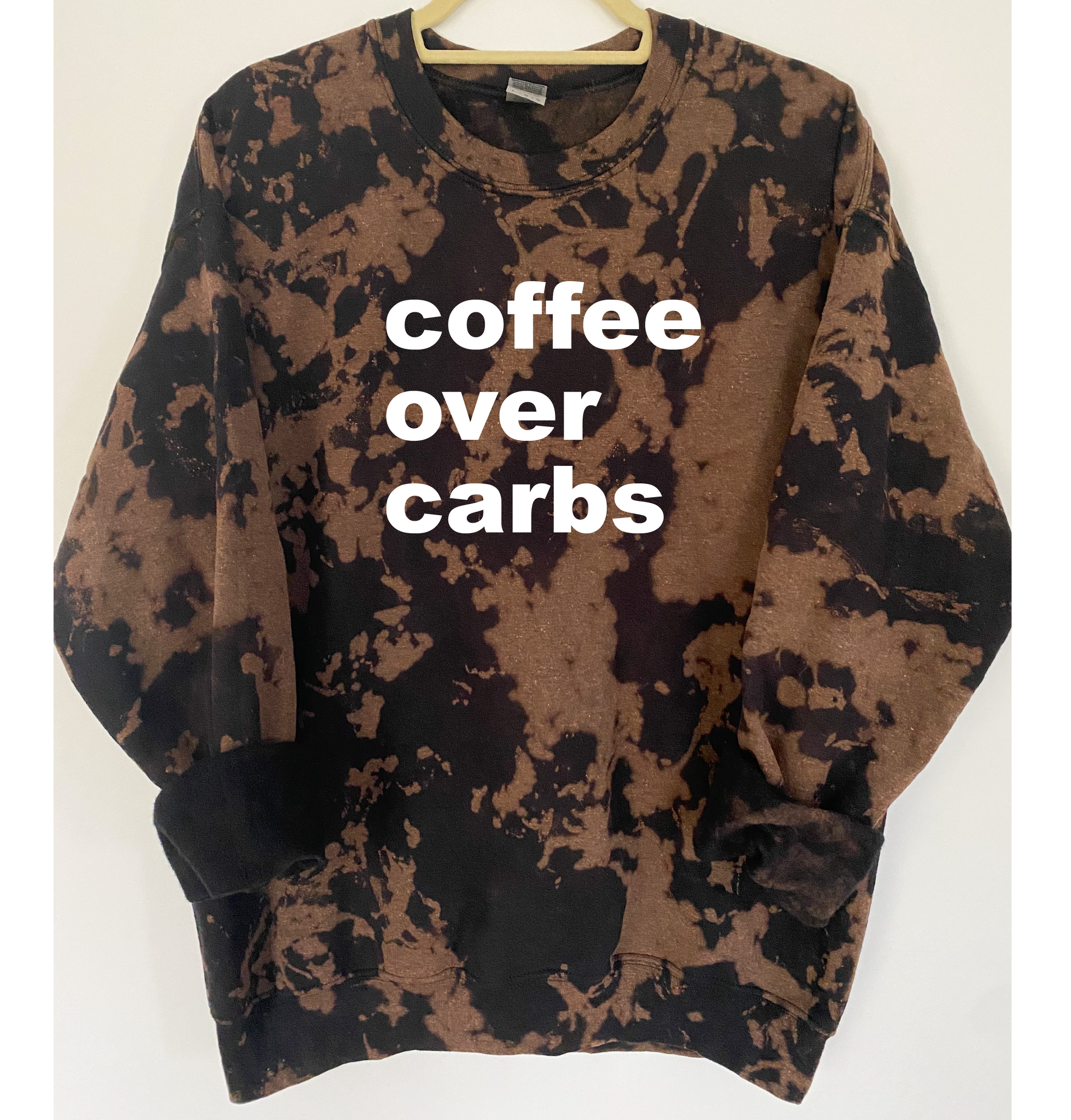 "Coffee Over Carbs" is ironed on with Premium Vinyl. Soft, stretchable and fade resistant. Turn the garment inside out and machine wash with cold water. Tumble dry low.