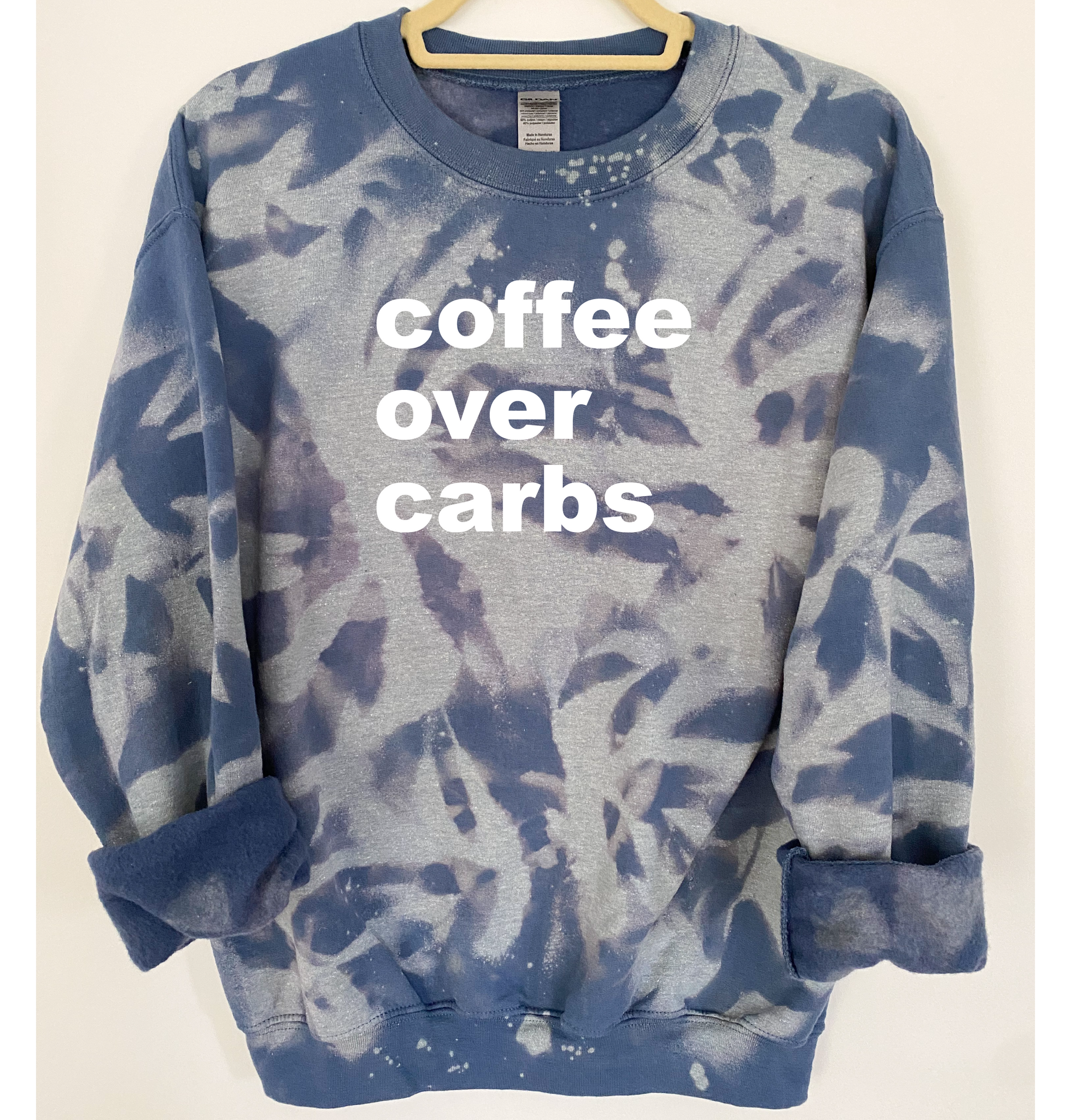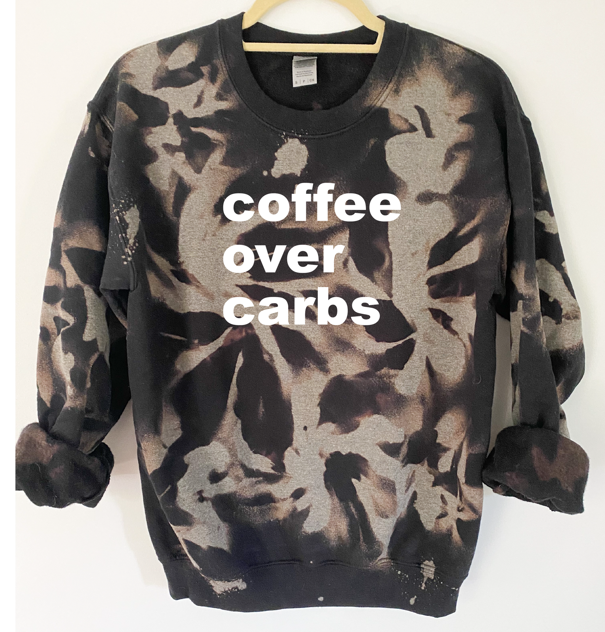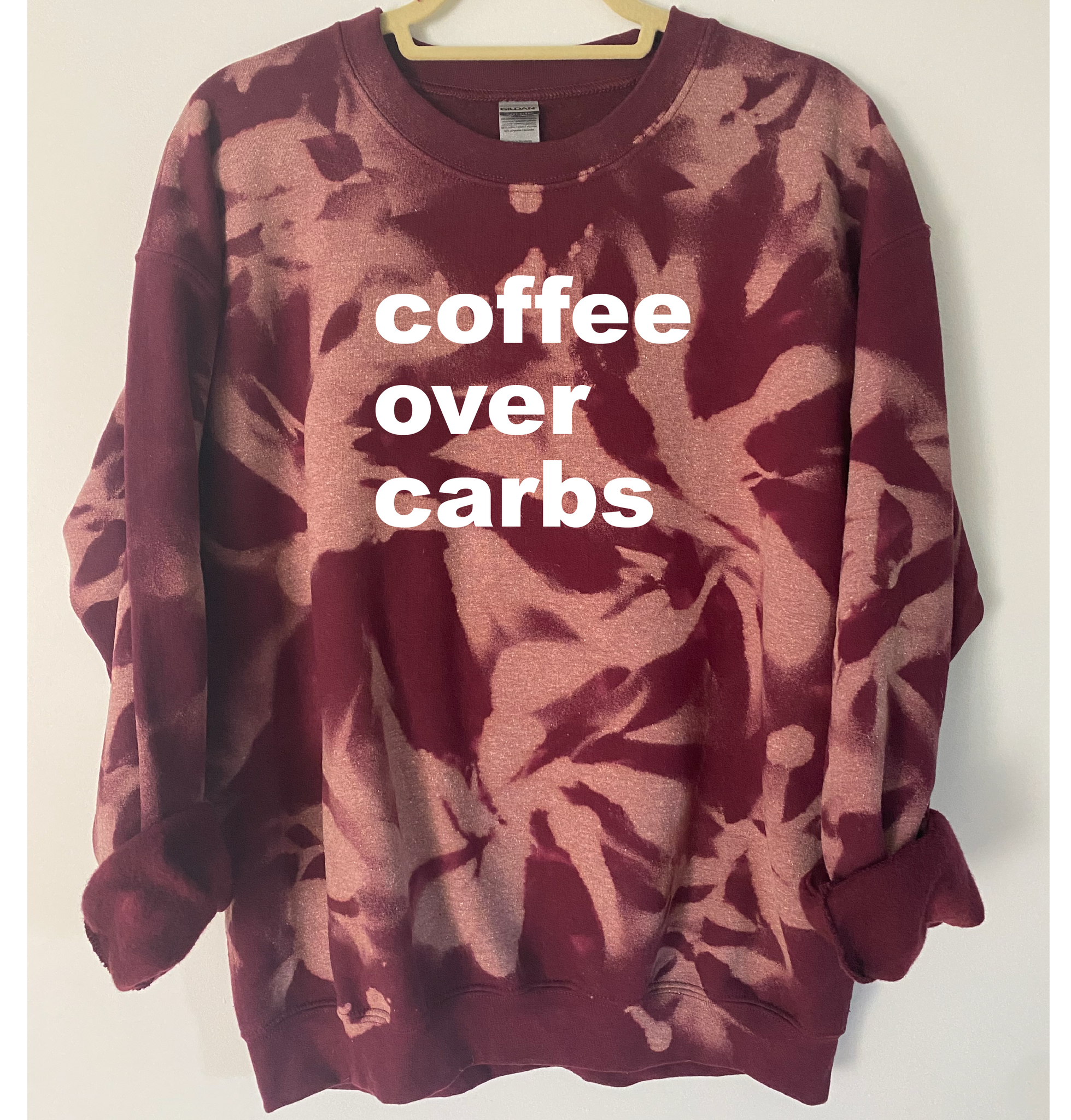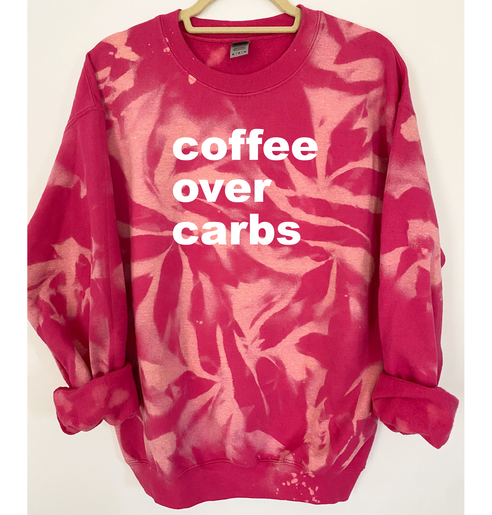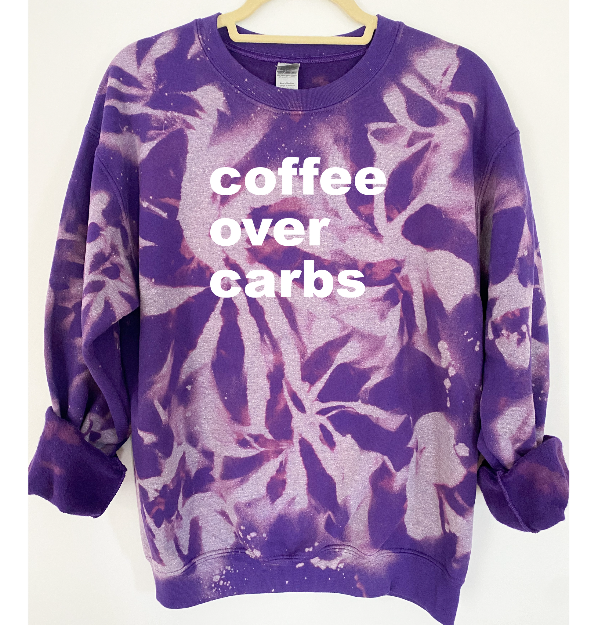 "Coffee Over Carbs" is ironed on with Premium Vinyl. Soft, stretchable and fade resistant. Turn the garment inside out and machine wash with cold water. Tumble dry low.