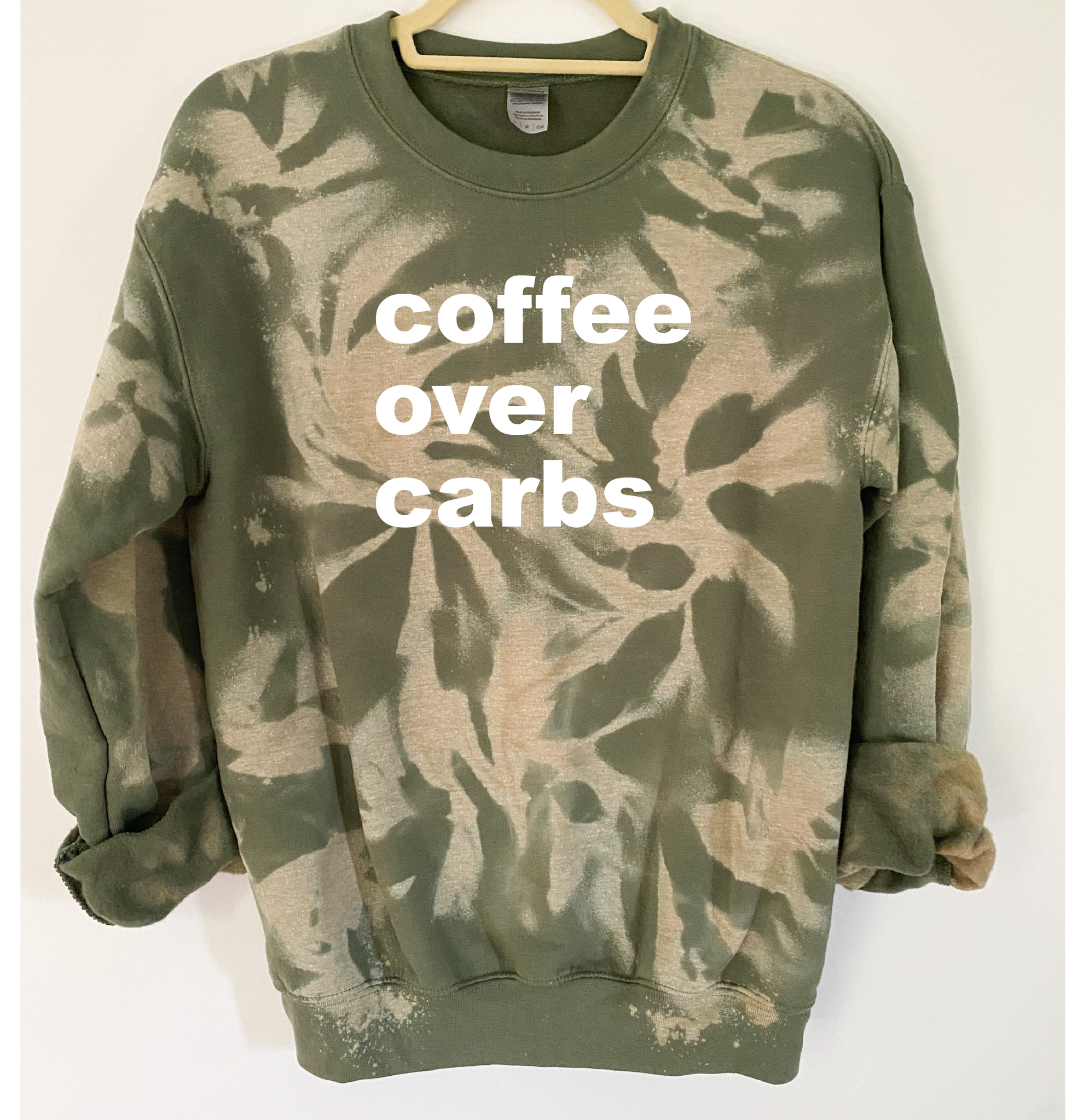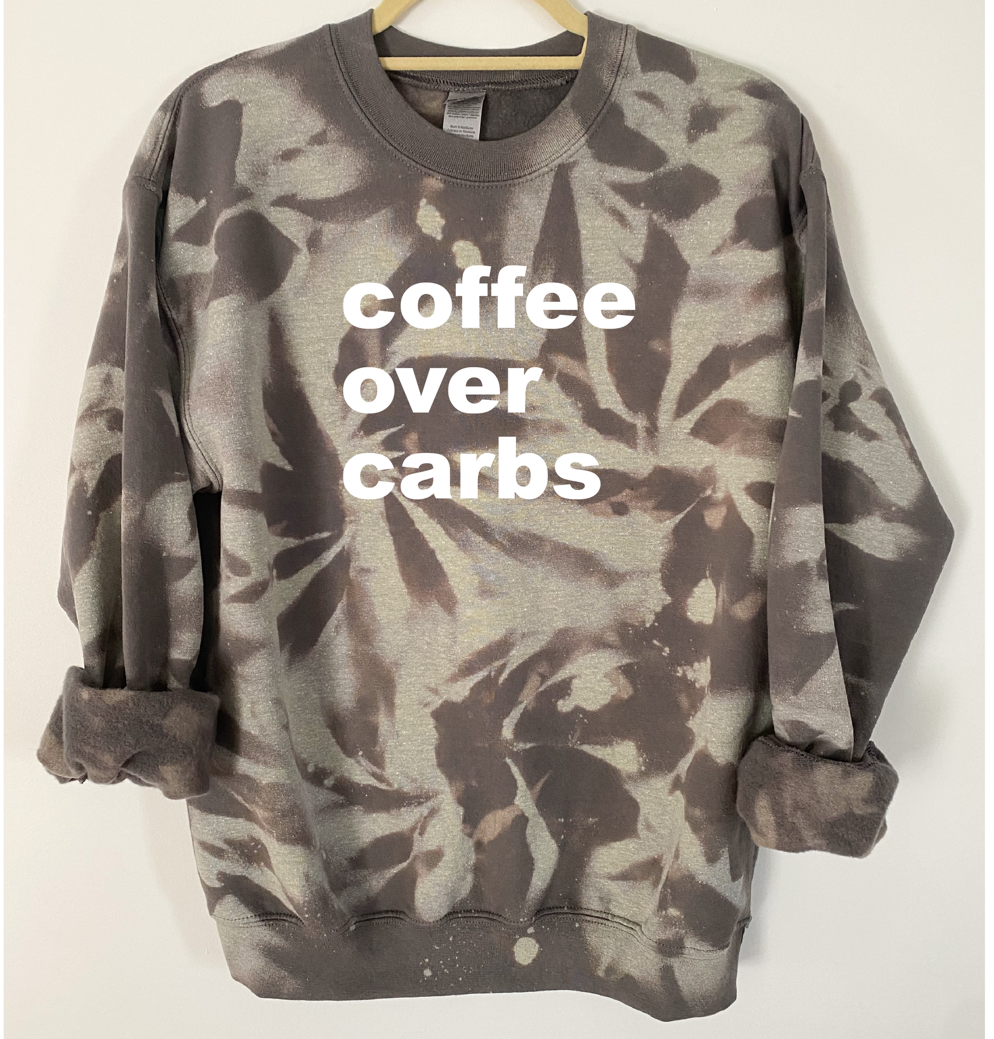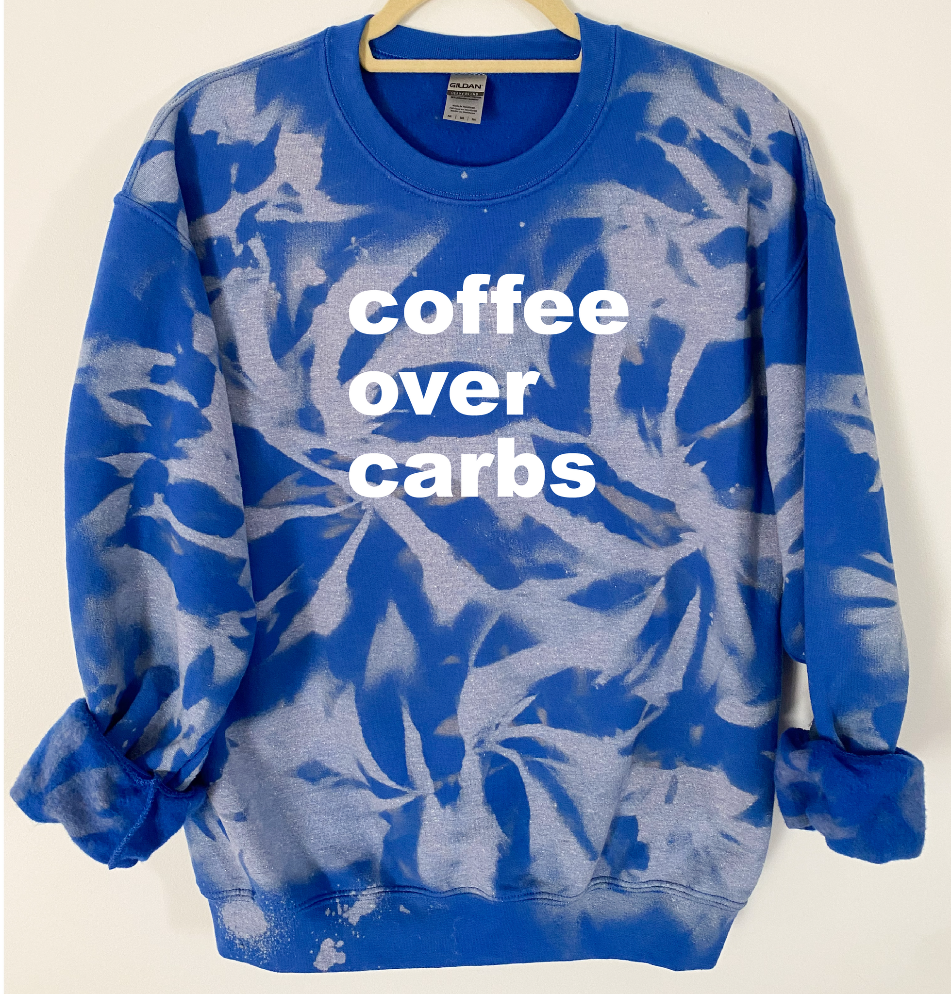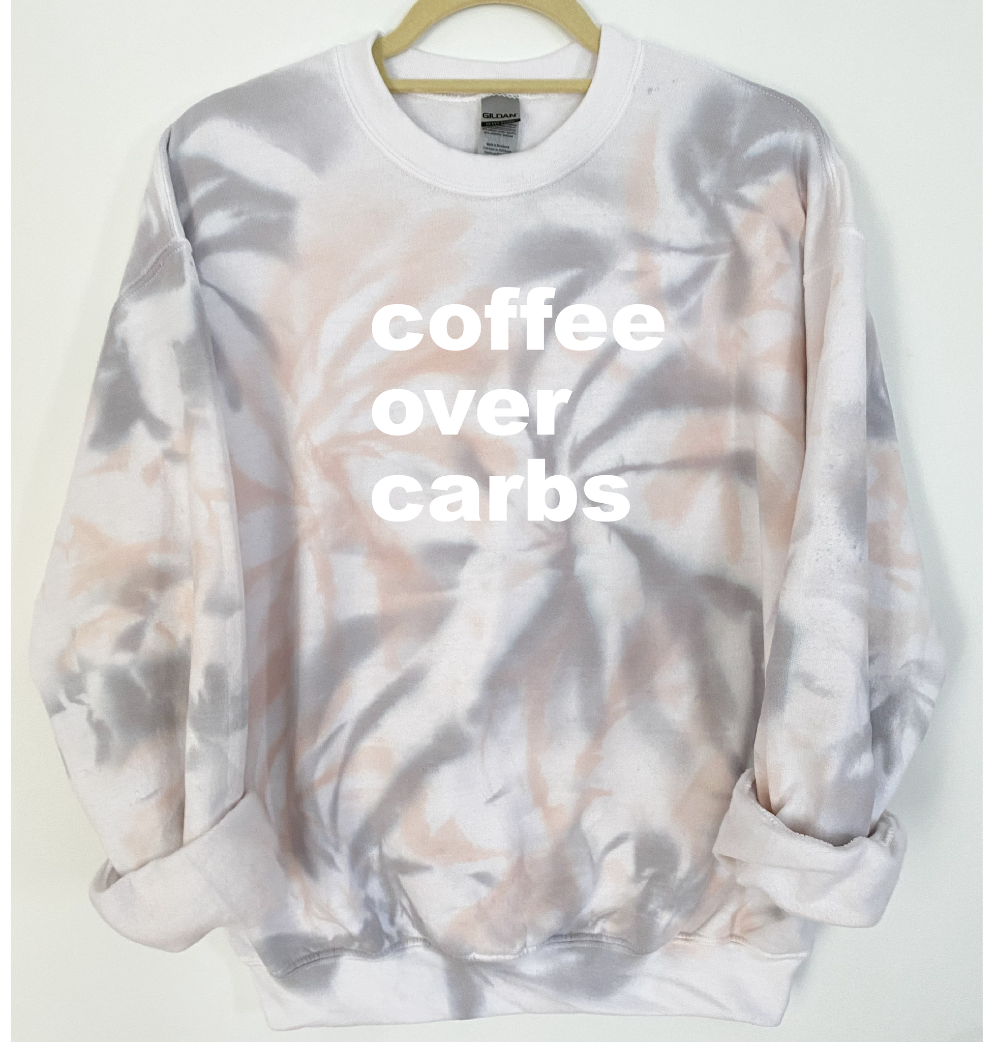"Coffee Over Carbs" is ironed on with Premium Vinyl. Soft, stretchable and fade resistant. Turn the garment inside out and machine wash with cold water. Tumble dry low.