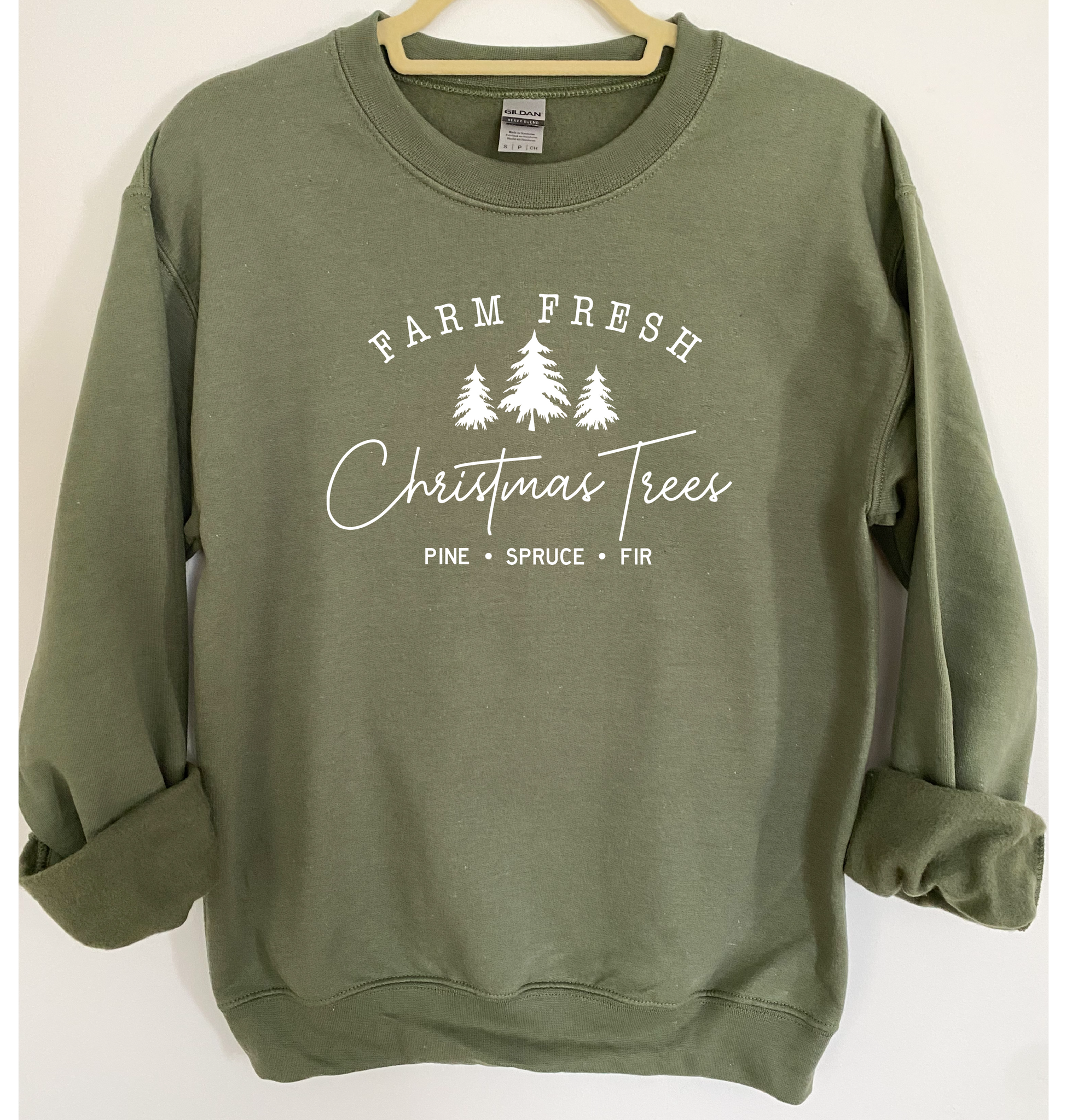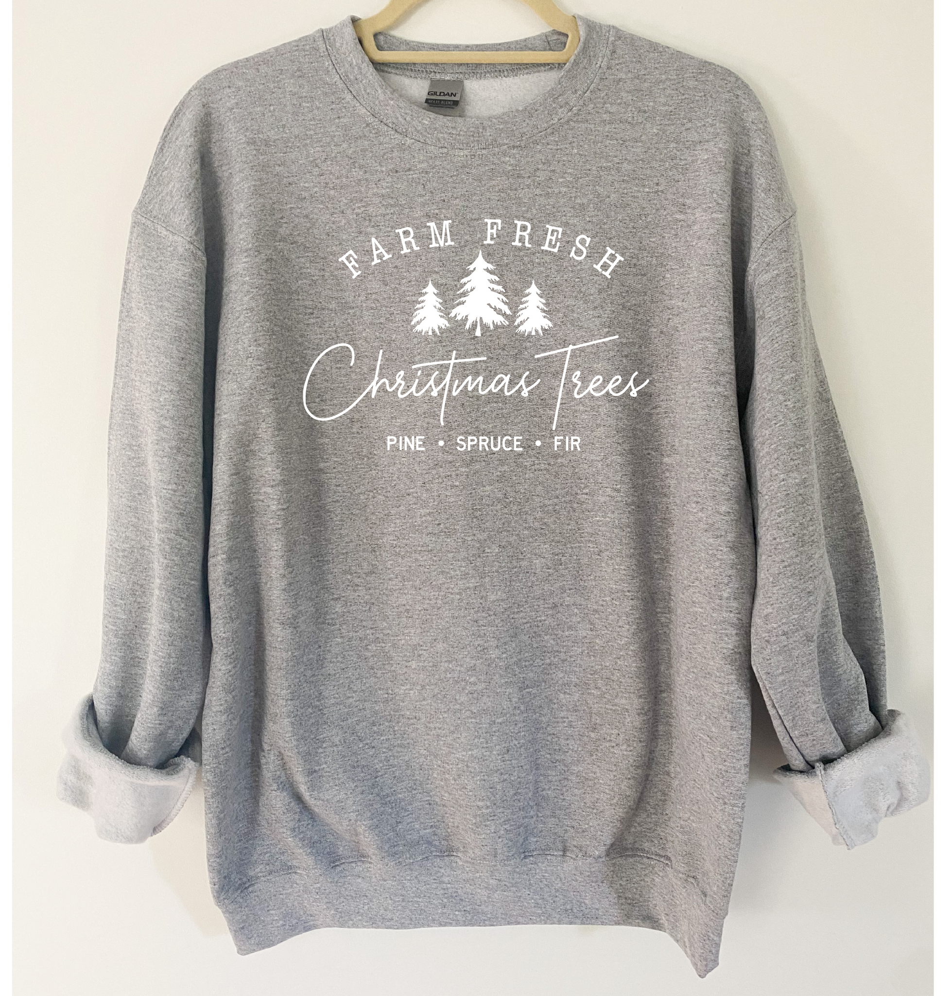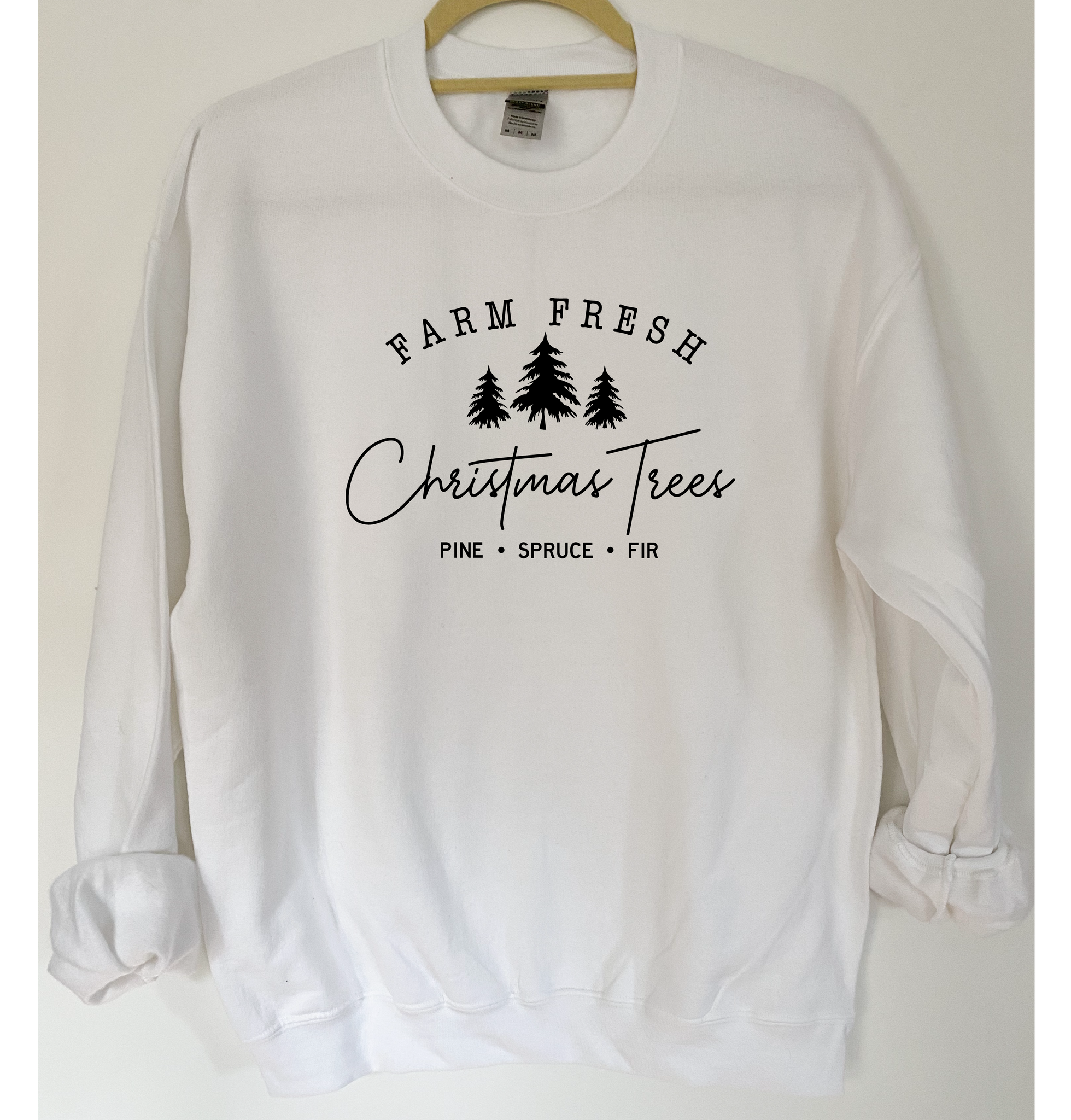 "Farm Fresh Christmas Trees" is ironed on with Premium Vinyl. Soft, stretchable and fade resistant. Turn the garment inside out and machine wash with cold water. Tumble dry low.