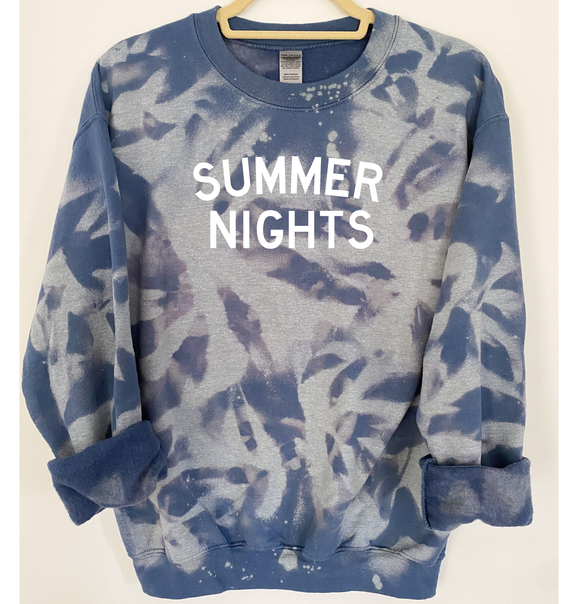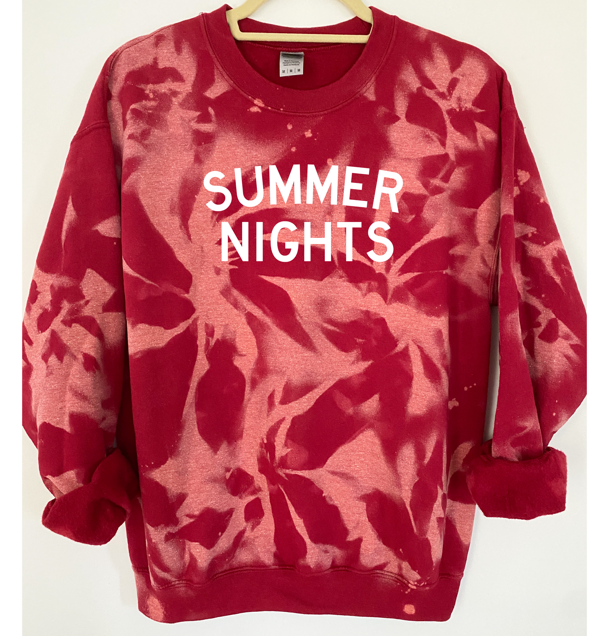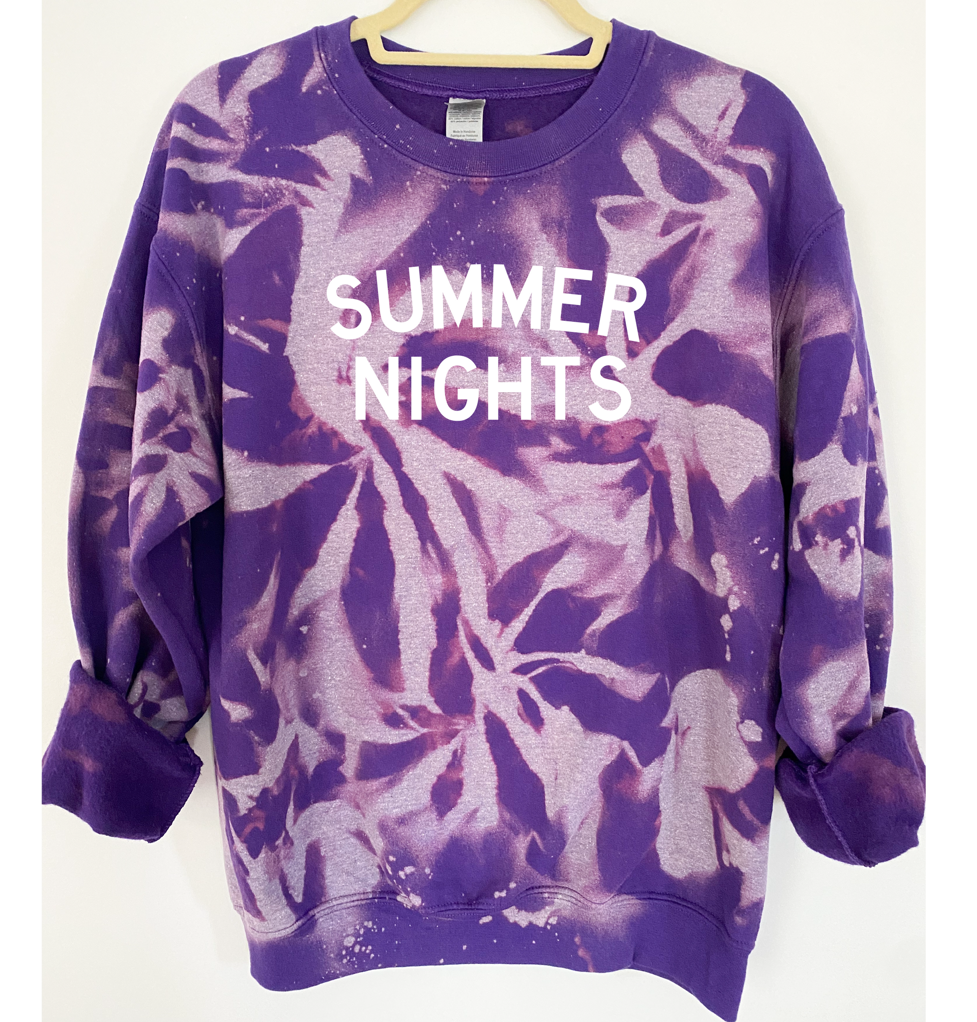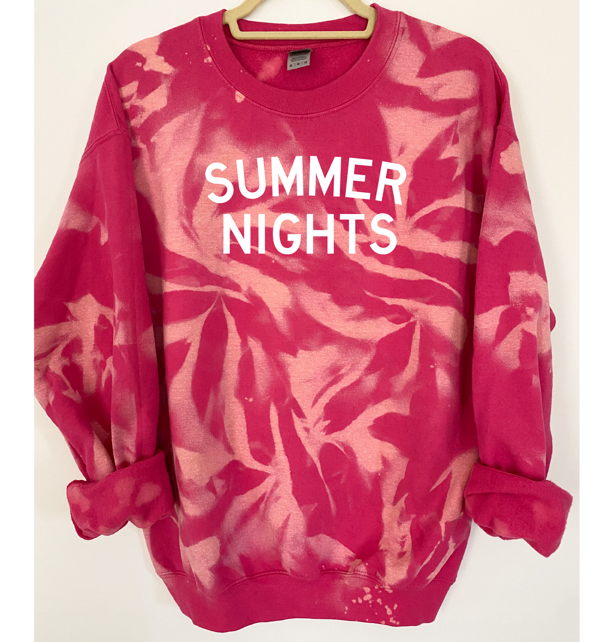 "SUMMER NIGHTS" is ironed on with Premium Vinyl. Soft, stretchable and fade resistant. Turn the garment inside out and machine wash with cold water. Tumble dry low.