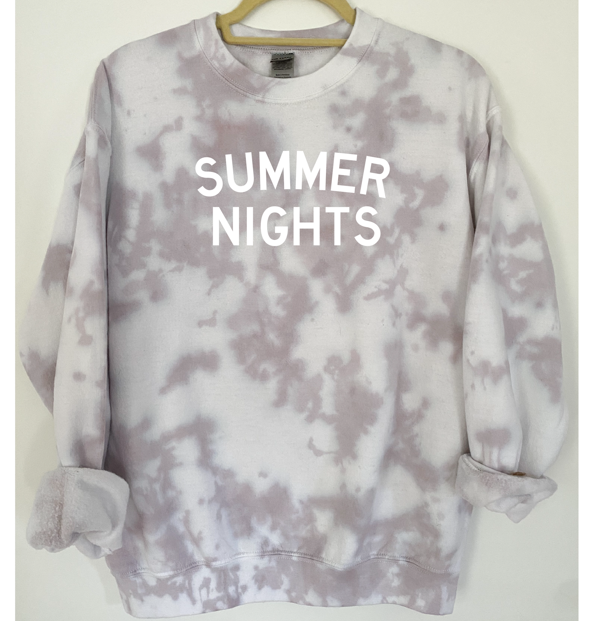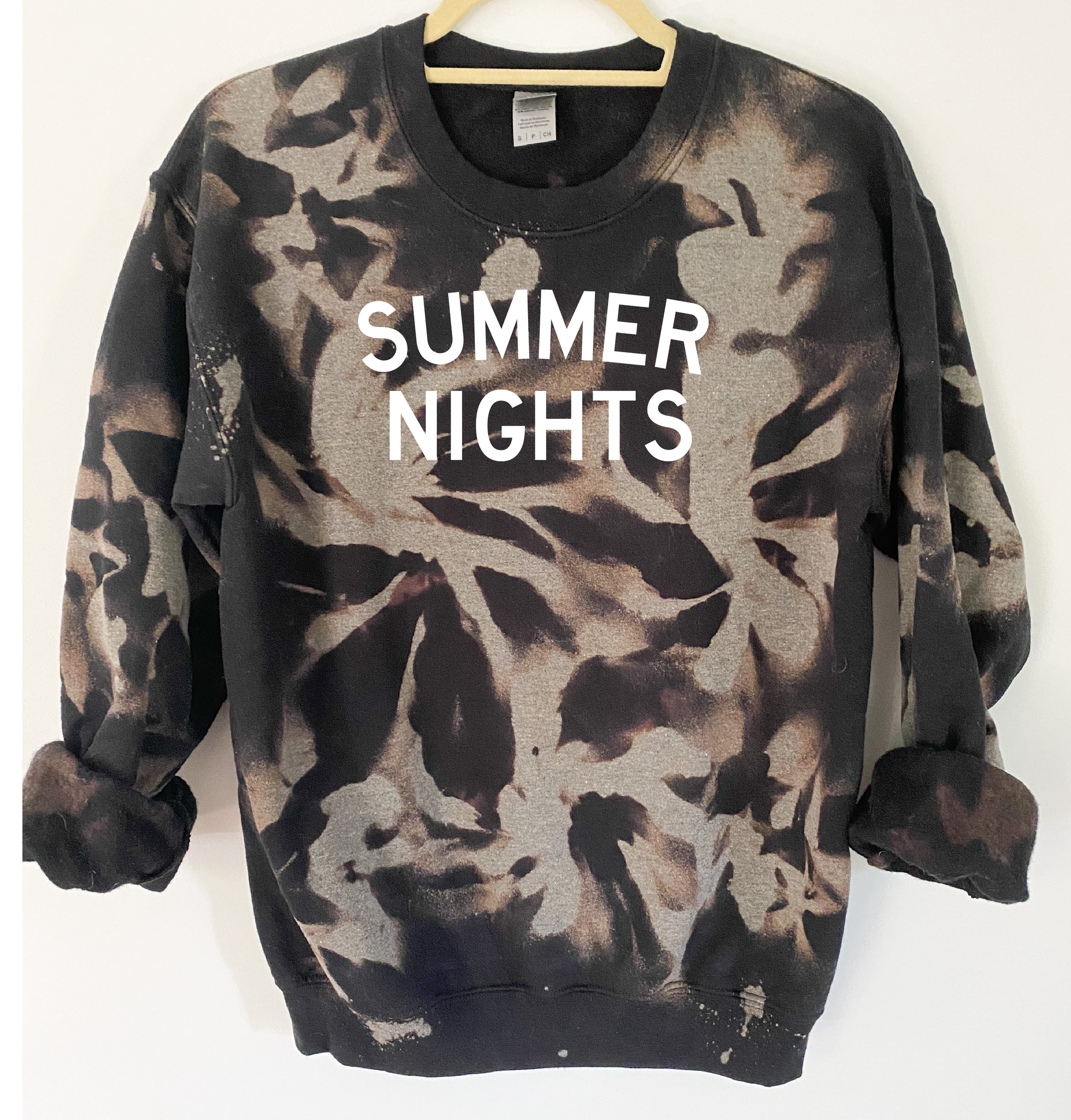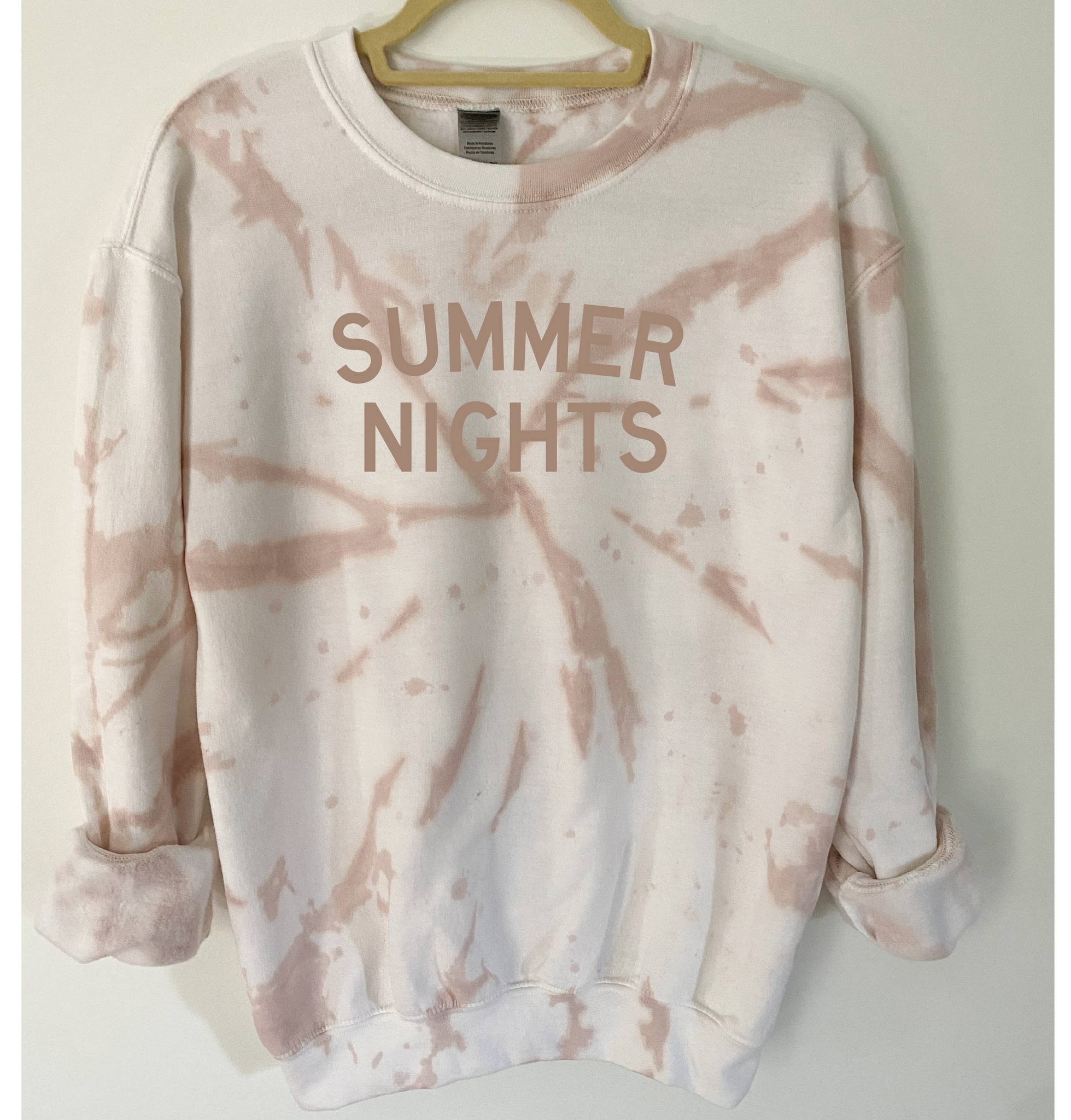 "SUMMER NIGHTS" is ironed on with Premium Vinyl. Soft, stretchable and fade resistant. Turn the garment inside out and machine wash with cold water. Tumble dry low.