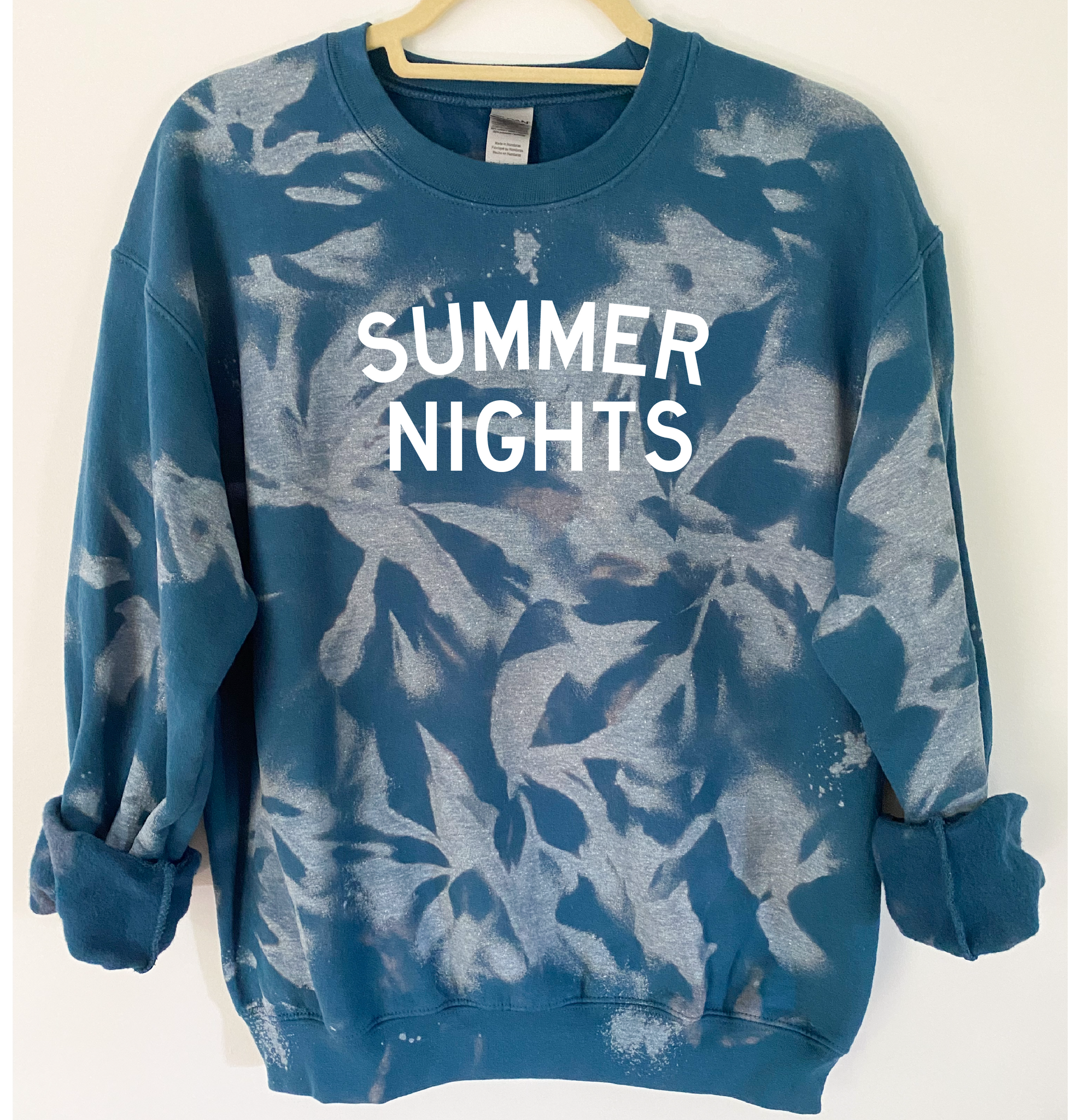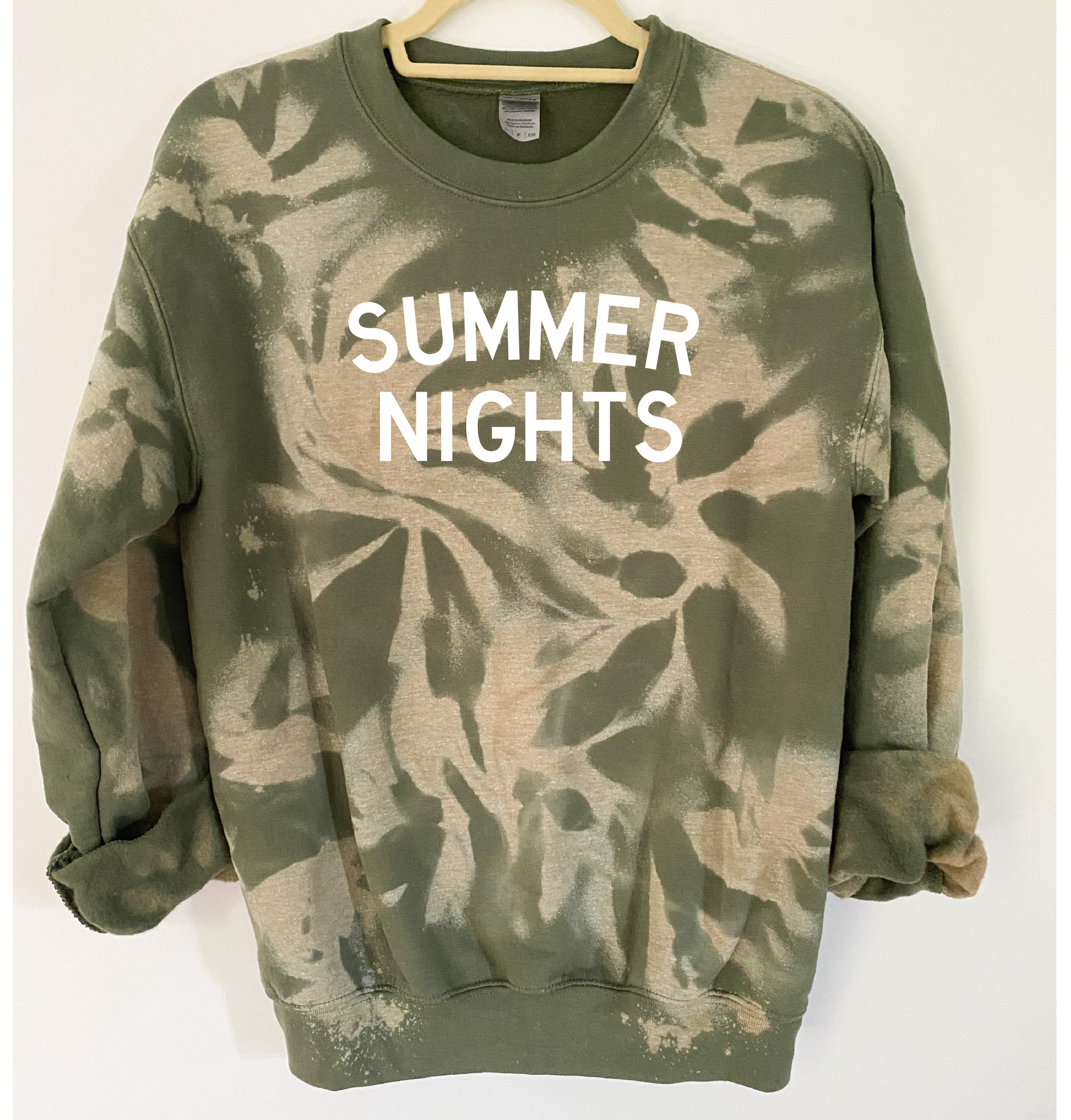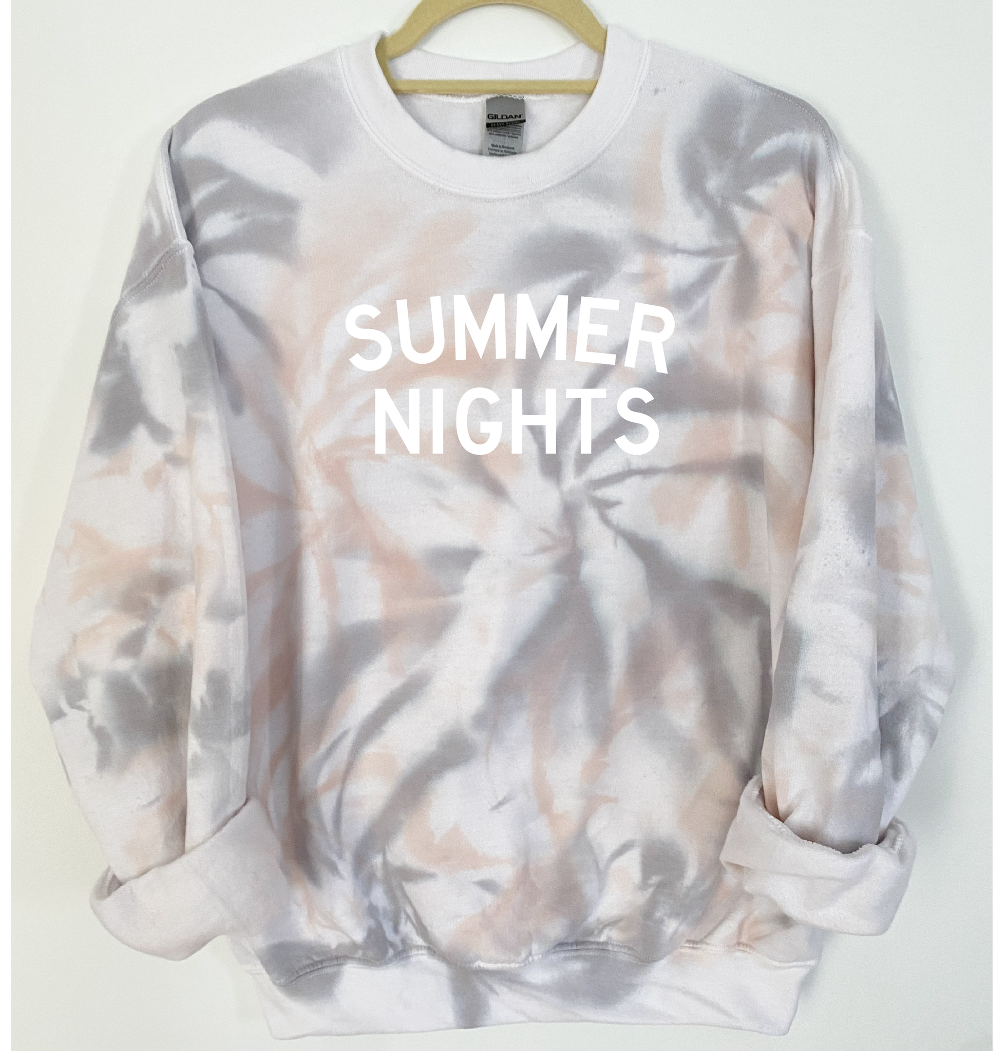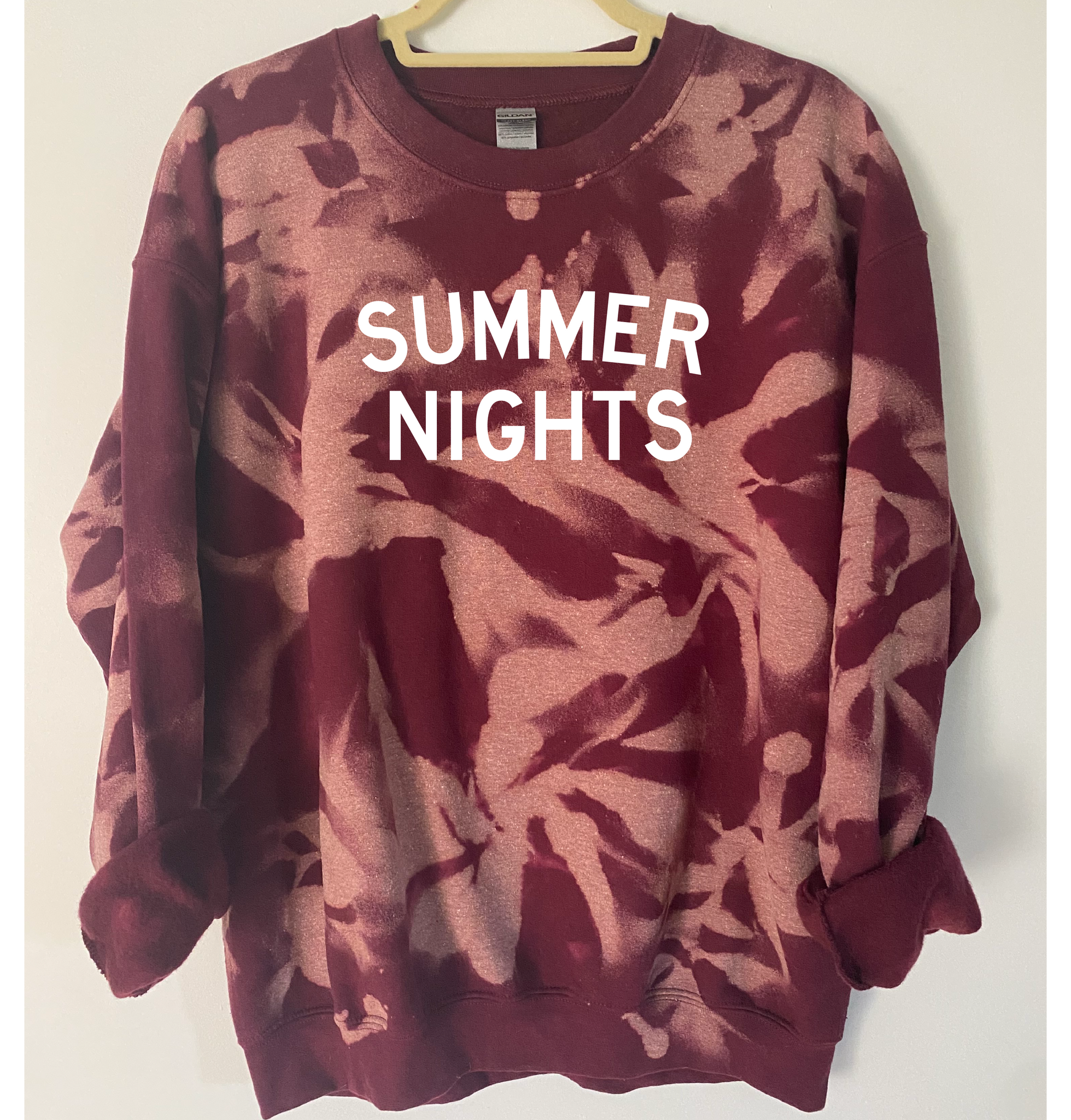 "SUMMER NIGHTS" is ironed on with Premium Vinyl. Soft, stretchable and fade resistant. Turn the garment inside out and machine wash with cold water. Tumble dry low.