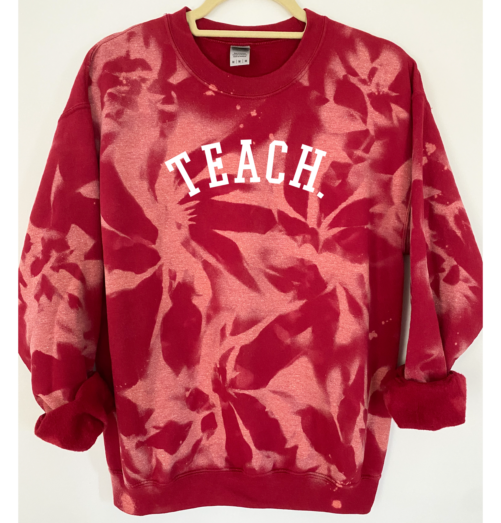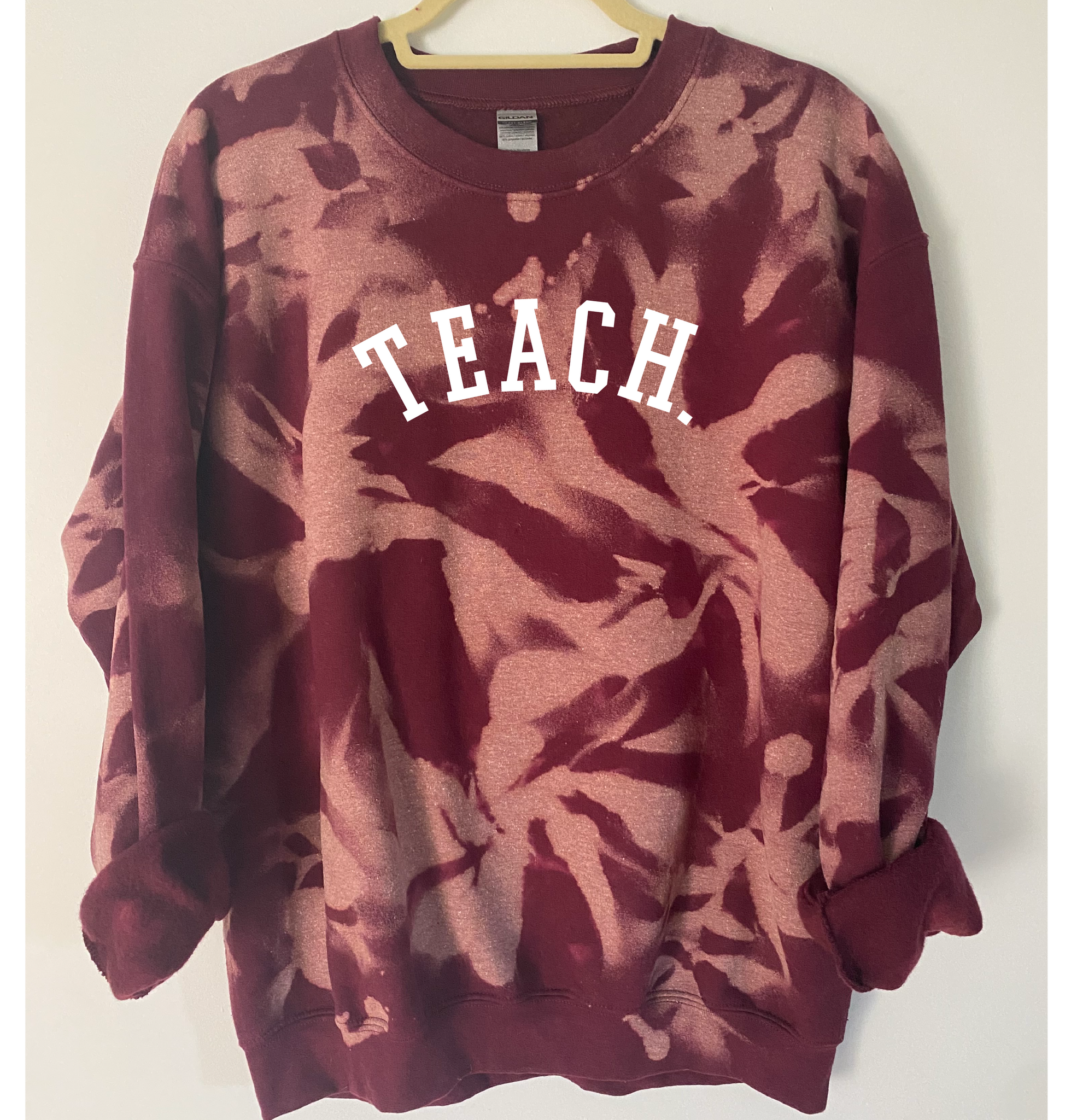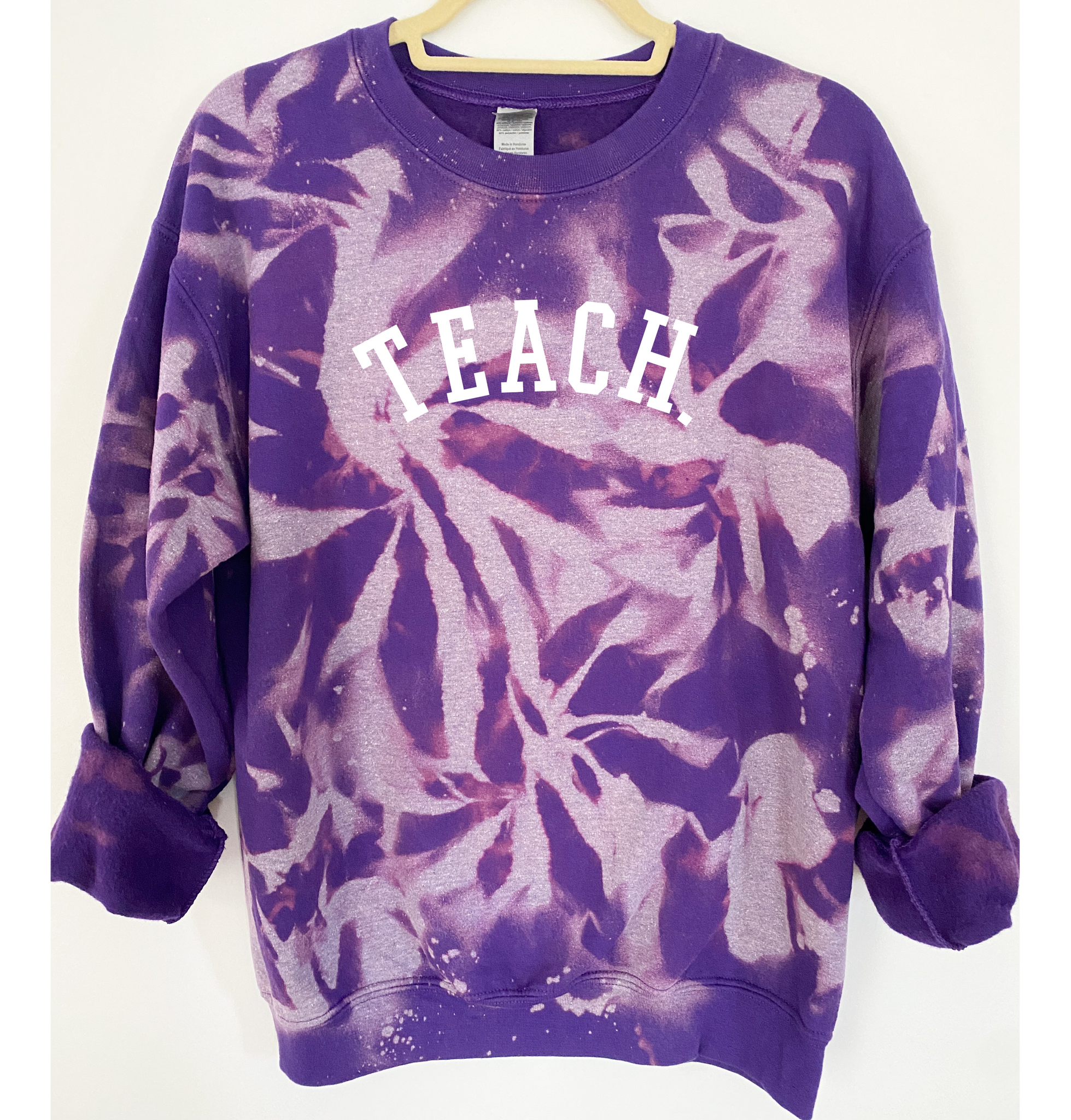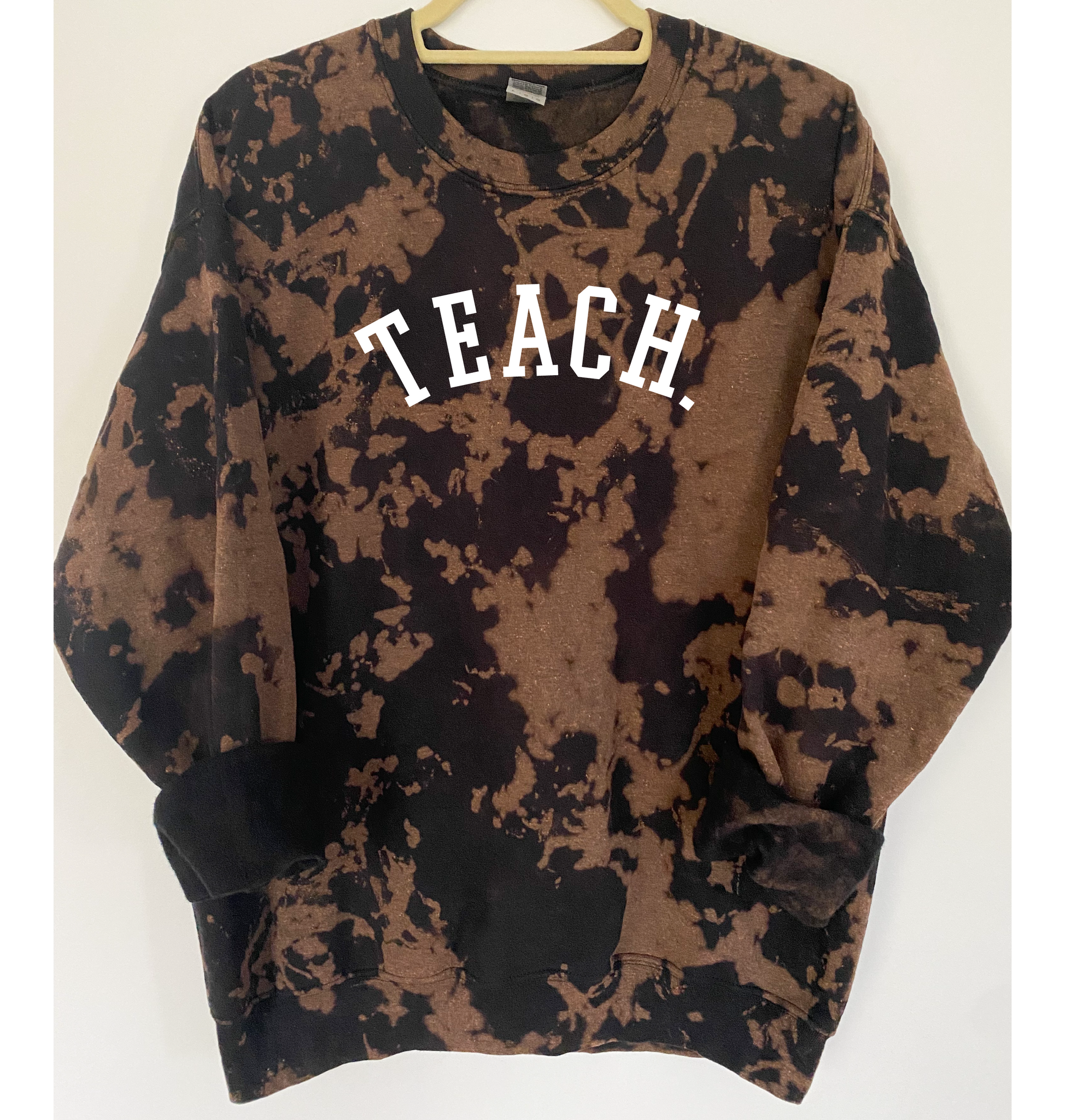 "TEACH" is ironed on with Premium Vinyl. Soft, stretchable and fade resistant. Turn the garment inside out and machine wash with cold water. Tumble dry low.