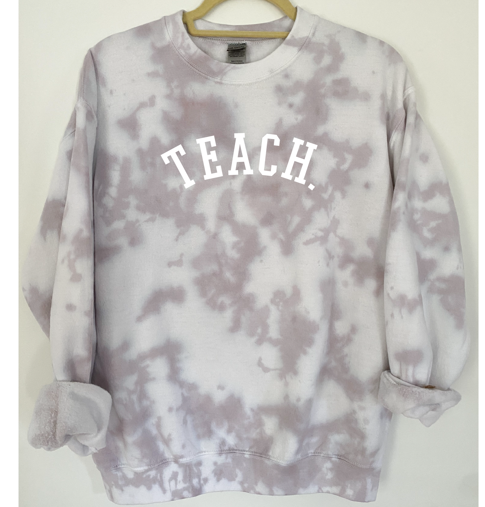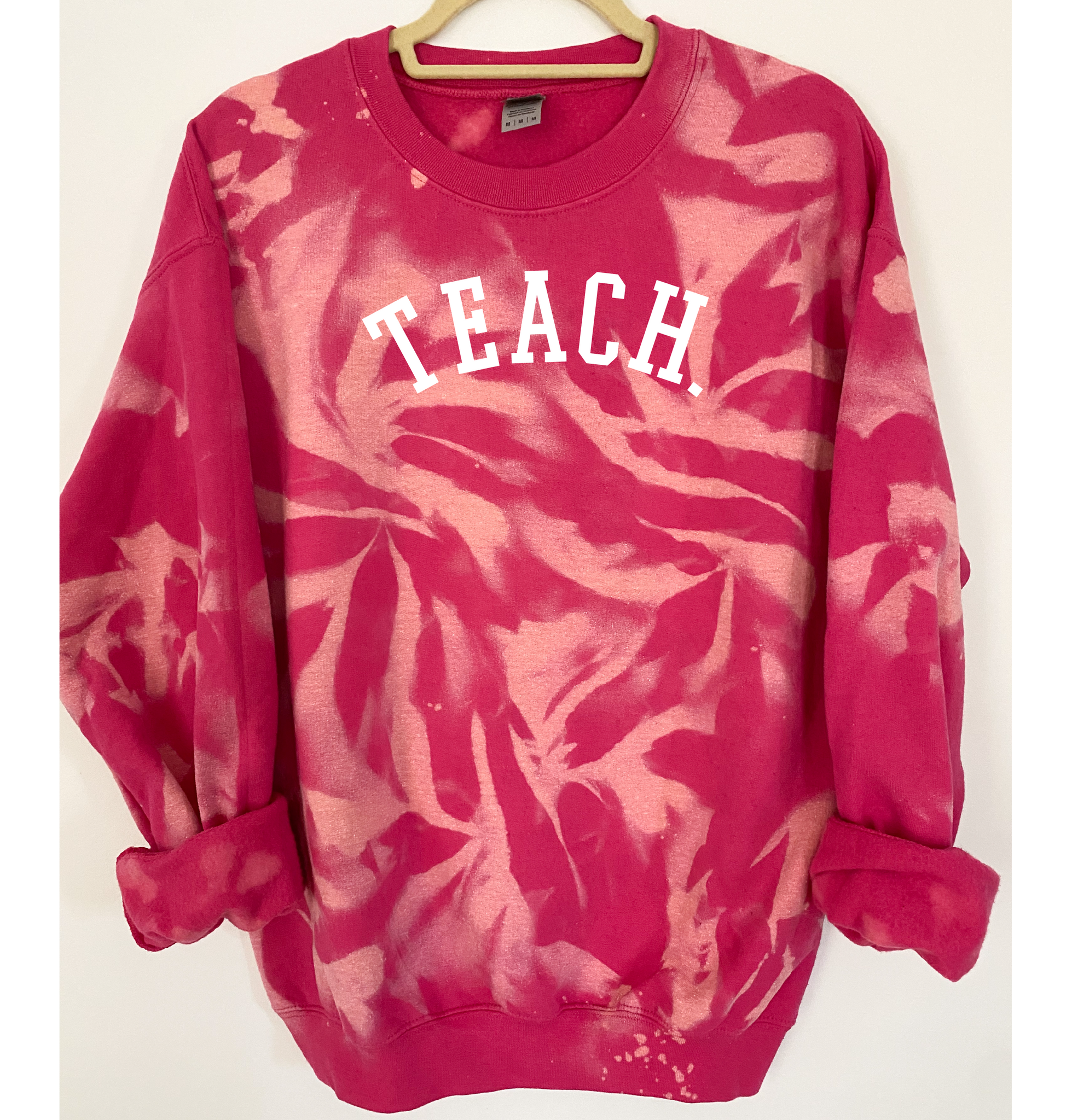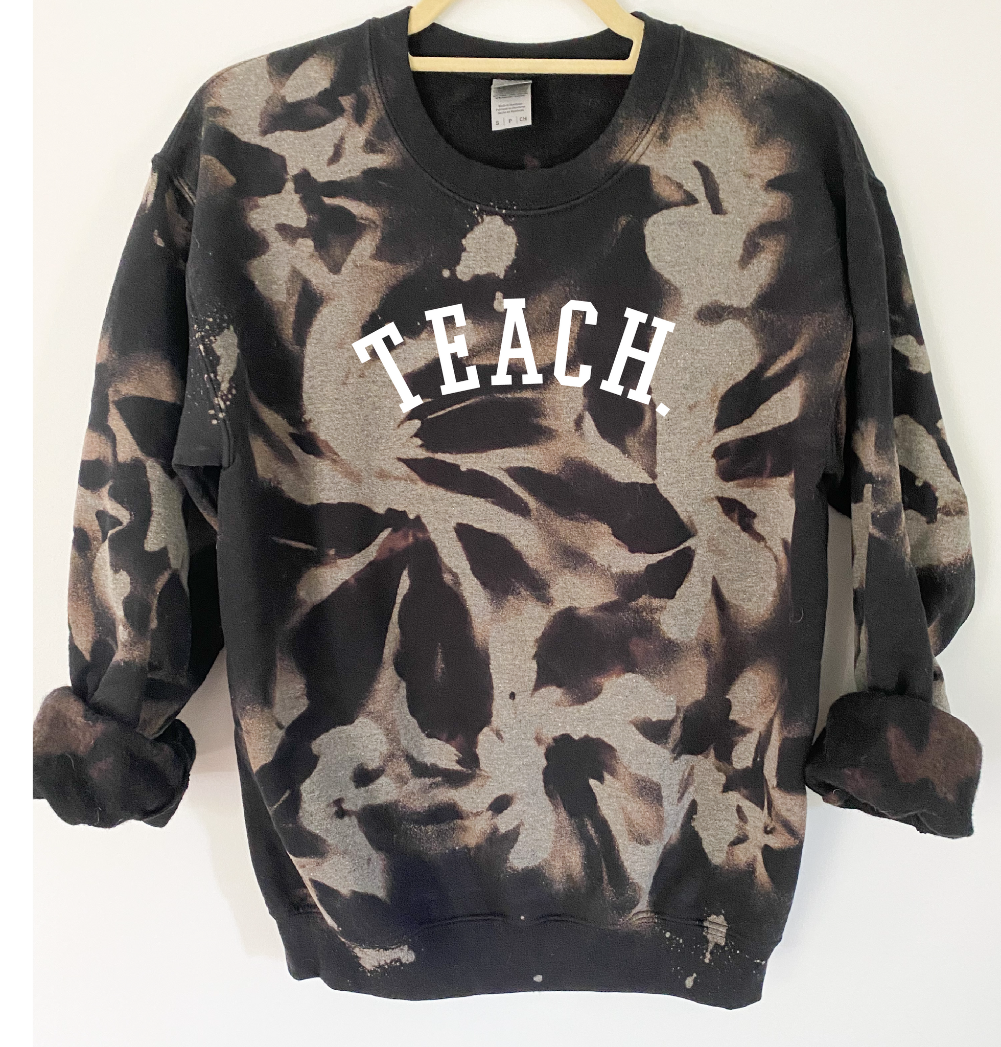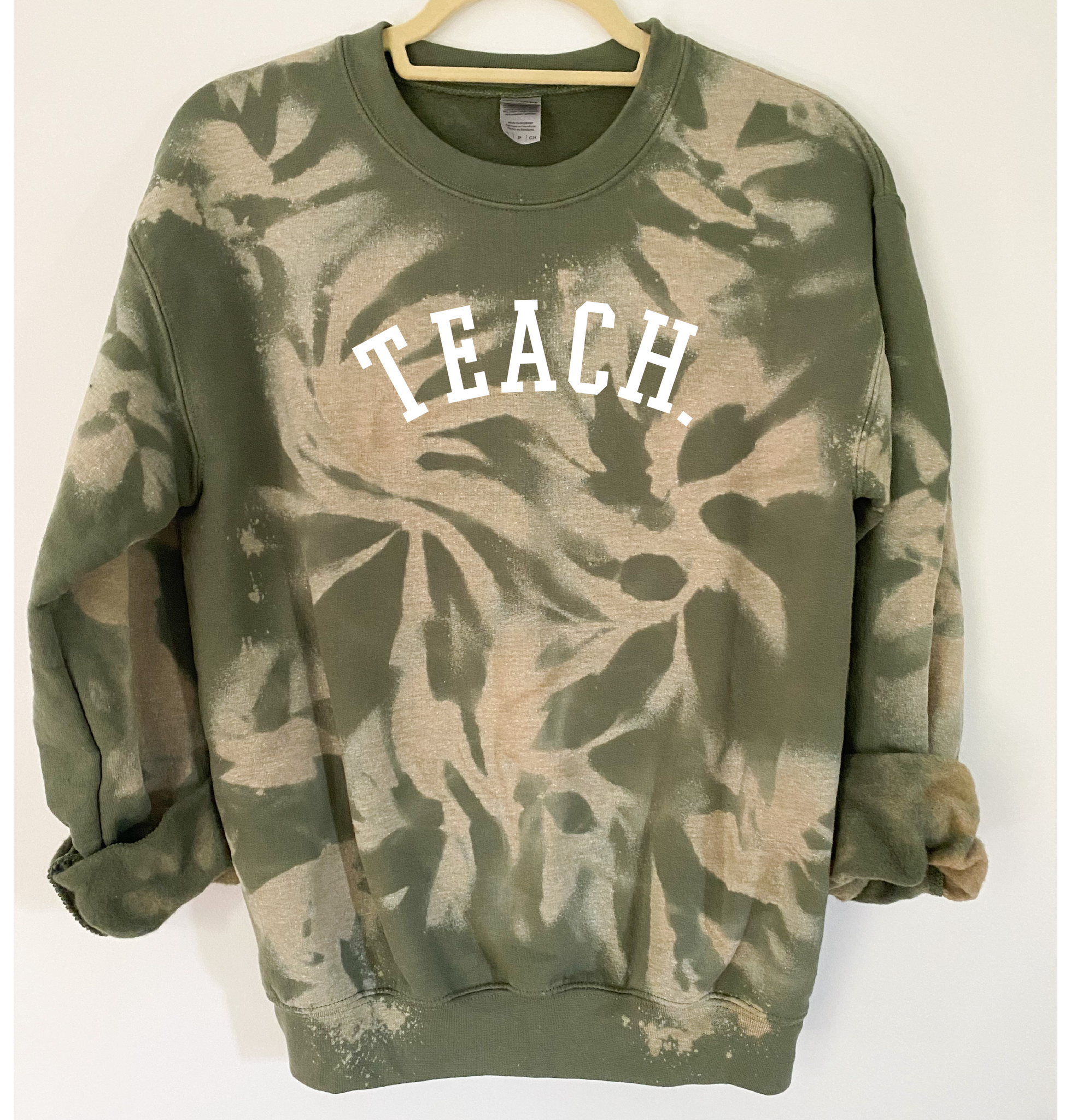 "TEACH" is ironed on with Premium Vinyl. Soft, stretchable and fade resistant. Turn the garment inside out and machine wash with cold water. Tumble dry low.