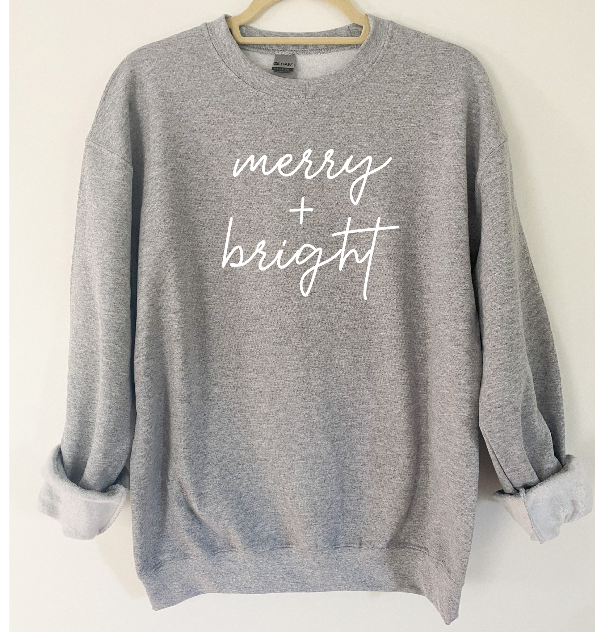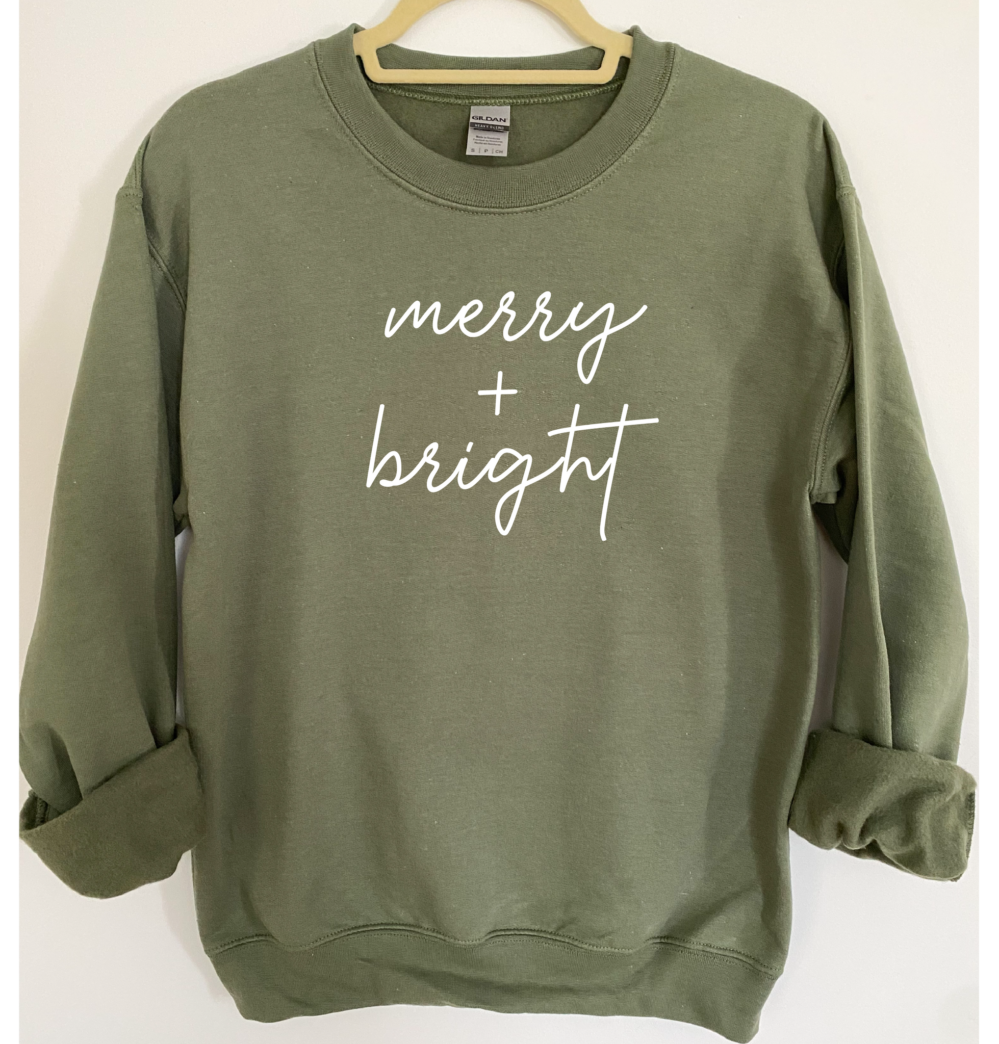 "Merry + Bright" is ironed on with Premium Vinyl. Soft, stretchable and fade resistant. Turn the garment inside out and machine wash with cold water. Tumble dry low.